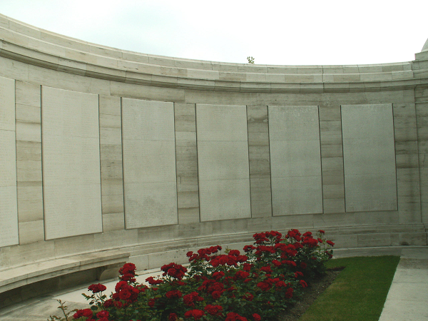 Loos Memorial Panel, Dud Corner CWGC Cemetery on site of Lens Road Redoubt with surrounding walls form memorial to 21,000 men with no known grave who fell at the Battle of Loos. Panels 78 to 83 record the names of over 700 of the Black Watch dead. Over the Memorial and the associated war-graves stands the almost universal tall white Cross of Sacrifice with bronze-coloured sword inset designed by Sir Reginald Blomfield.