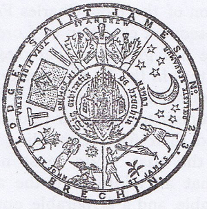 In 1761, John Spence, Commissary, resumed his old place as Master of the Lodge, and for several years there is little of special interest to record. Among the Brethren there seem to have been several men of standing, such as James Inverarity, Hospital Master (whose name appears with the date 1750 on a house in Bridge Street), James Hill, late Deacon of the Tailors, David Millar, late Deacon of the Shoemakers, and Robert Langlands, late Convener of the Trades. In 1768 the name "St. Ninian's" appears for the last time. In 1769, it is simply "The Mason Lodge of Brechin." Probably negotiations were proceeding which rendered it inexpedient to claim a title borne by another Lodge. On St. Andrew's Day 1770, there was produced a Charter of Constitution and Erection from the Grand Lodge of Scotland, bearing date at Edinburgh, the 13th November, constituting and erecting the Lodge into a Regular Lodge by style and title of St. James's Lodge in Brechin. The Brethren appointed to office under this Charter were those on whose petition it had been granted, viz.:— John Spence, Master, James Millar and John Spence Junior, Wardens, Robert Hodge, Treasurer, and Alexander Strachan, Secretary. The Charter bore no number. In was only in 1800, thirty years later, that Grand Lodge informed its Members that it was number 162. It was subsequently altered to 122, and later to its present number, so easy for its sons to remember, 123.