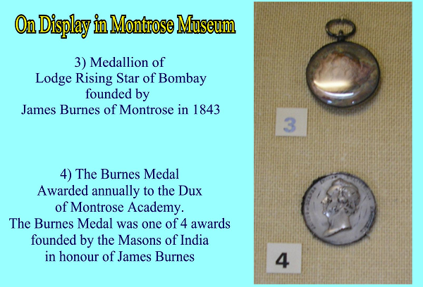 Burnes was re-elected Master in 1844 and the Lodge struck a special medal. He also consecrated Lodge St Andrew’s in the East at Poona in 1844 and they presented him with a “Knights Cross of the Guelphic Order’ enriched with brilliants, this as a mark of their esteem”. In return Burnes presented them with a bible. In 1846 he was promoted to the post of Superintending Surgeon of the Bombay Army, and Provincial Grand Master of the “Three Presidencies in India & Aden”. The Indian Lodges on the departure of Chevalier Burns from India in 1849 struck medals for “The encouragement of learning and good conduct in the Grant Medical College, the Byculla Schools in India and also Montrose Academy”, Montrose Academy, James Burnes’s old school in Scotland. Today, one hundred and sixty years after he left India the Burnes ‘Dux’ medal is still being presented at Montrose Academy. Chevalier James Burnes died on the 19th September 1862 in Manchester.