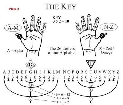 With the use of mirroring, or perfect symmetry, the numerical equivalents of the first half of our alphabet, A-M, can now be transferred to the second half of our alphabet, N-Z. This is best displayed on the human hands. The “A” or Alpha is one’s left thumb and the “Z” or Zed, representing the end or Omega is one’s right thumb with the 12 sections of one’s four fingers, 24 in total, representing the remaining 24 letters of our alphabet (Plate 10).