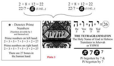 We see on the stained-glass window shown below, from an Episcopal church in Iowa, built in 1868, the Tetragrammaton is slightly modified from the original Hebrew representation (Plate 6). Here the Tetragrammaton is symbolized as Pi 7 Pi 7.