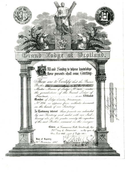 The 9th Earl's Grand Lodge of Scotland Diploma on him Joining Lodge Airlie No.268 |