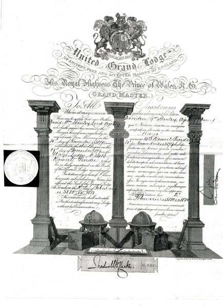 the 9th Earl's United Grand Lodge of England Diploma on him Joining the Mayo Lodge, Rawlpindi, India |