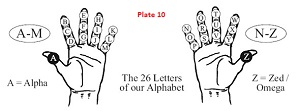 With the use of mirroring, or perfect symmetry, the numerical equivalents of the first half of our alphabet, A-M, can now be transferred to the second half of our alphabet, N-Z. This is best displayed on the human hands. The “A” or Alpha is one’s left thumb and the “Z” or Zed, representing the end or Omega is one’s right thumb with the 12 sections of one’s four fingers, 24 in total, representing the remaining 24 letters of our alphabet (Plate 10).
