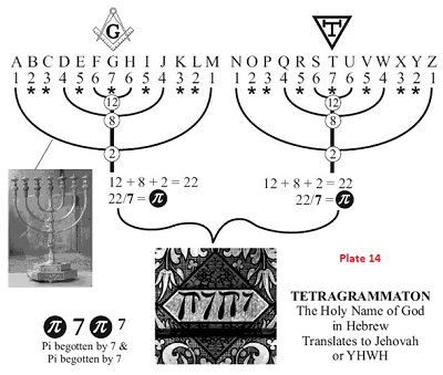 This 22 is connected by the central pillar of the menorah leading to the 7. A whole number approximation of Pi can be found by dividing 22 by 7 equalling 3.142. This yields us Pi begotten by 7 on the left hand of our alphabet and Pi begotten by 7 on the right hand of our alphabet.